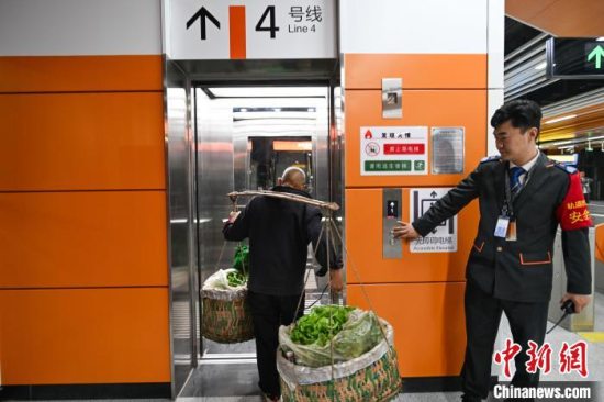 4月3日,重慶軌道交通4號線石船站,工作人員幫助菜農搭乘電梯。中新網記者何蓬磊 攝